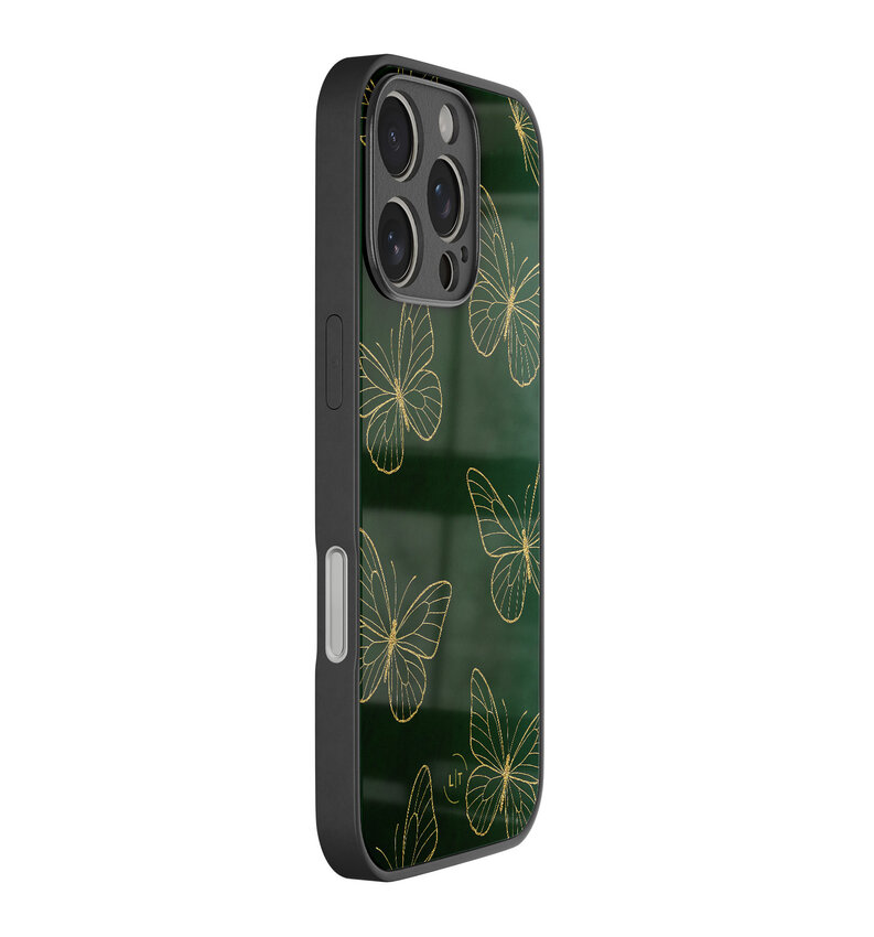 iPhone 16 Pro hoesje glas - Emerald butterflies