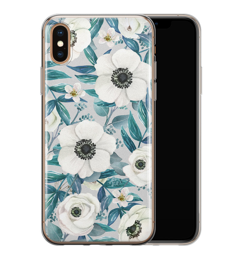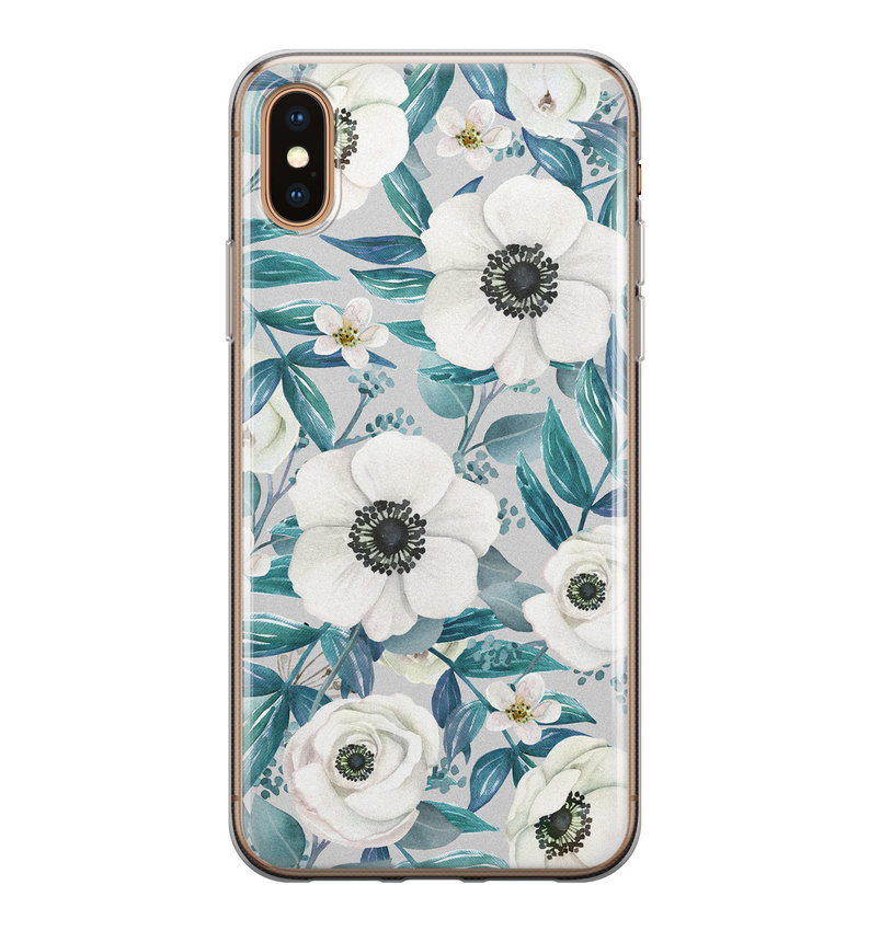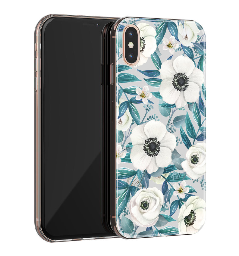 Dit telefoonhoesje beschermt jouw telefoon tegen alledaagse schade zoals schokken, stof en krasjes. Op de achterkant wordt een kunstwerk van witte bloemen gepresenteerd. Een stevige beschermlaag voor je iPhone X/XS.