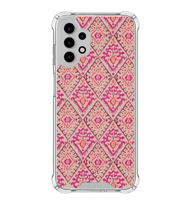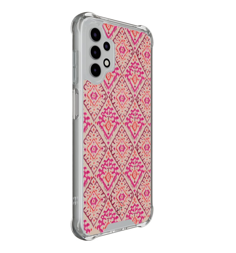Ontdek de charme van het Ibiza Art Deco hoesje voor je Samsung Galaxy A13 4G. De roze kleuren en geografische patronen geven jouw telefoon een instant upgrade. De schokabsorberende hoeken waken over je telefoon tegen onverwachte schade.