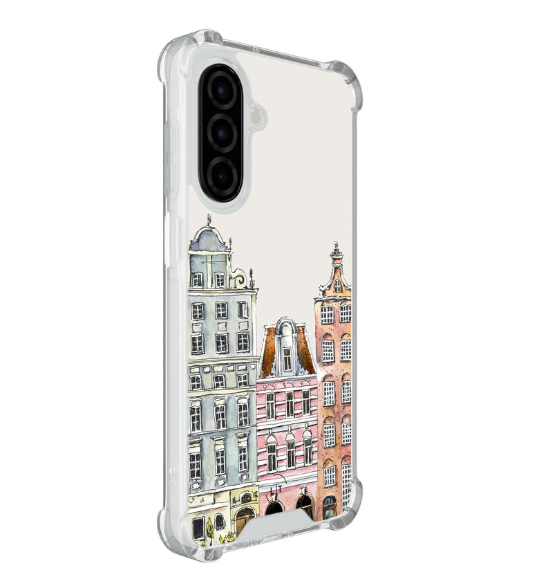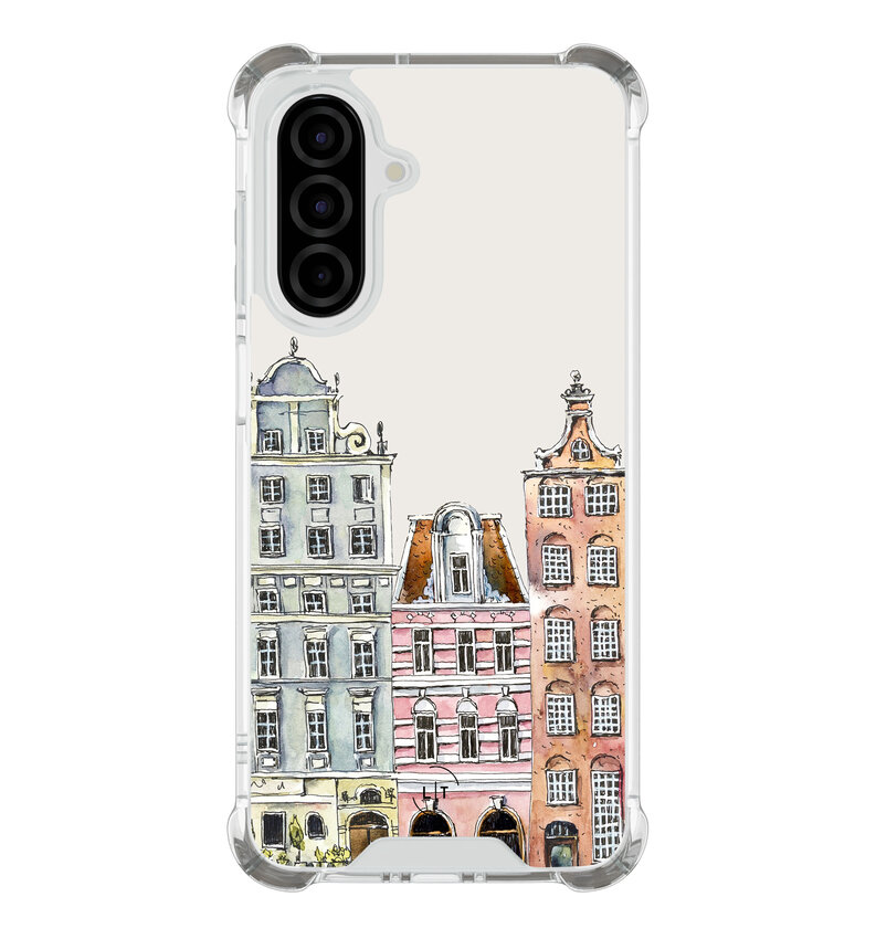Neem een stukje Nederlandse charme overal mee naartoe met de 'Grachtenpandjes' hoes. Dit unieke design toont pittoreske grachtenhuizen, terwijl de stevige constructie van de smartphonehoes je telefoon beschermt tegen alledaagse ongelukken.