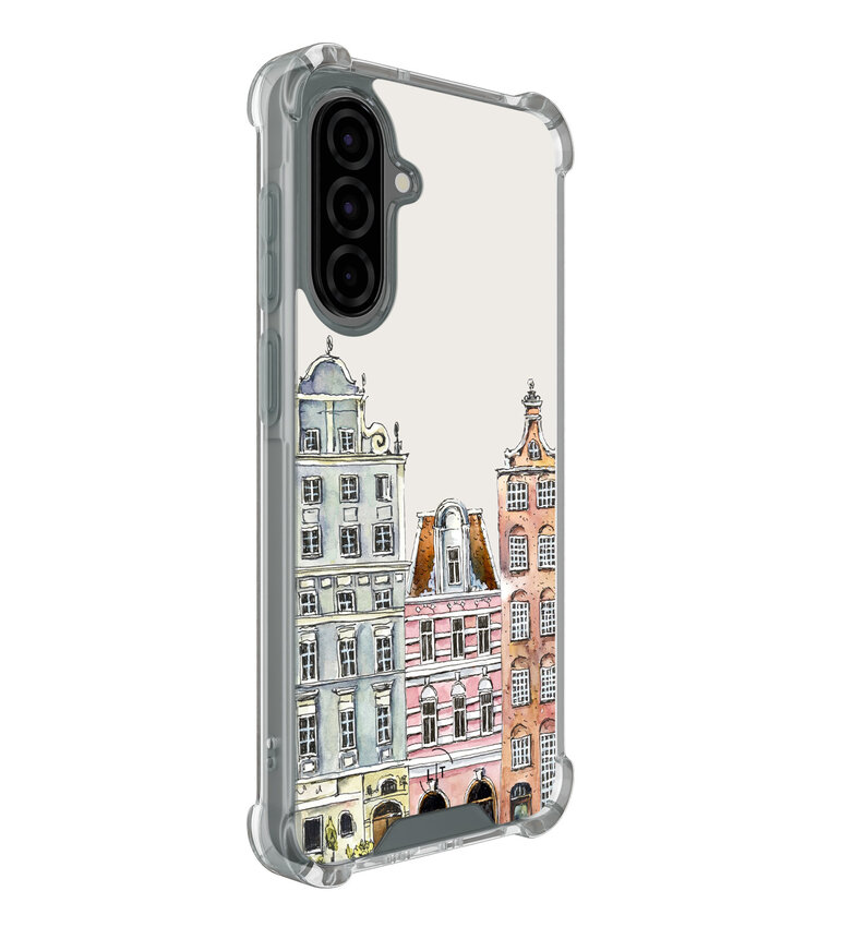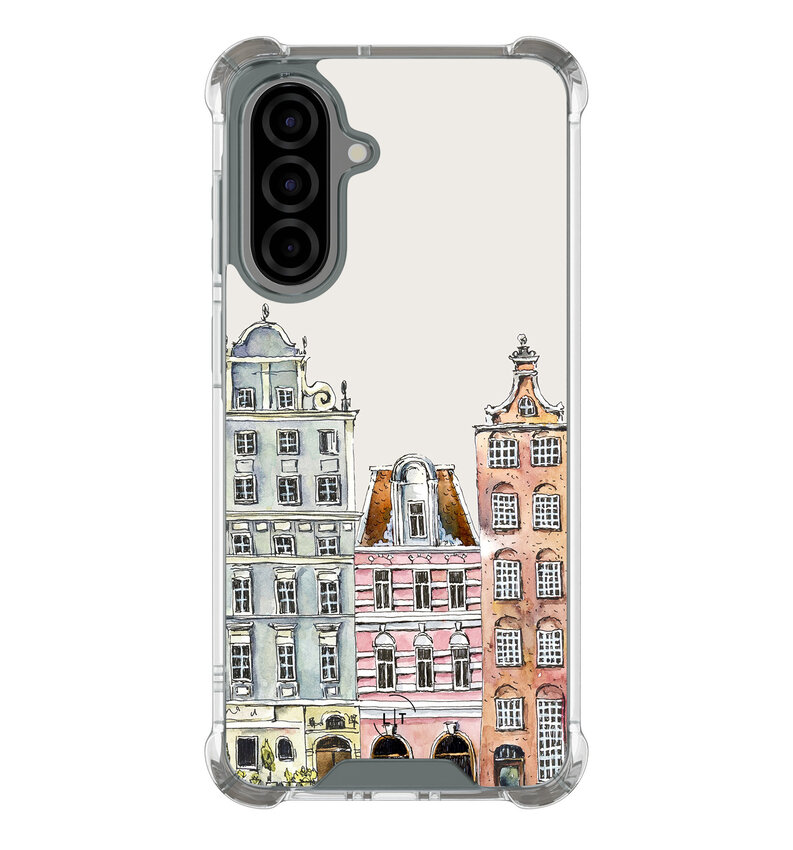 Neem een stukje Nederlandse charme overal mee naartoe met de 'Grachtenpandjes' hoes. Dit unieke design toont pittoreske grachtenhuizen, terwijl de stevige constructie van de smartphonehoes je telefoon beschermt tegen alledaagse ongelukken.