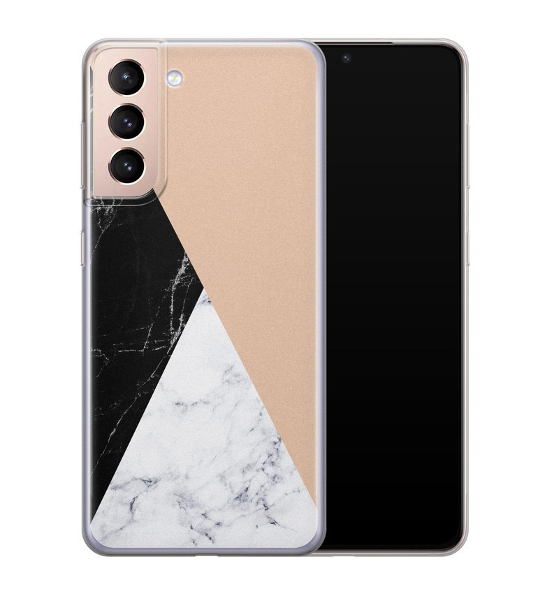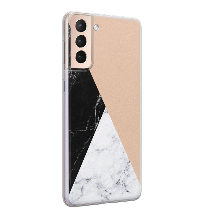 Marmer maar dan met een twist, dat is dit Samsung Galaxy S21 Plus hoesje zeker! Het flexibele telefoonhoesje is dun en heeft een naadloze pasvorm. Hierdoor wordt het geheel niet veel dikker en zwaarder.
